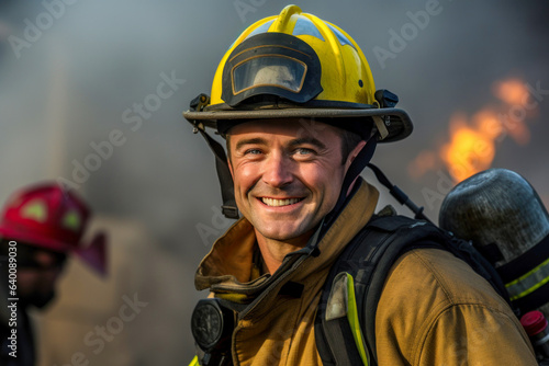Fototapeta premium Photo of a smiling firefighter in front of a blazing fire