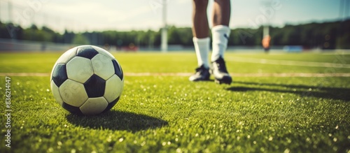 Fototapeta premium Photo of a soccer ball being kicked by a player, with copy space image.