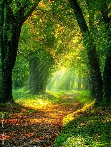 © DDU, Obraz premium Photo of a sunlit forest path surrounded by tall trees and lush greenery