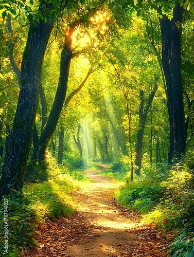 © DDU, Obraz premium Photo of a sunlit forest path surrounded by tall trees and lush greenery