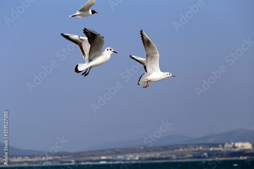 © tanor27, Fototapeta premium Photo of a white gull in a blue sky