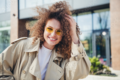 © deagreez, Fototapeta premium Photo of adorable nice girl dressed stylish beige clothes city megapolis autumn season sunny weather outdoors