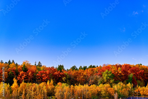 © Вячеслав Чичаев, Naklejka premium Photo of an autumn forest with colorful foliage in clear sunny weather against a beautiful blue sky. Bright colors are pleasing to the eye.