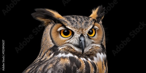 Fototapeta premium Photo of an eagle owl isolated against a black background, emphasising the eagle owl's majestic features. Wildlife and conservation concept, space for copy.