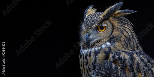 Fototapeta premium Photo of an eagle owl isolated against a black background, emphasising the eagle owl's majestic features. Wildlife and conservation concept, space for copy.