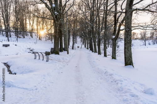 © Reinholds, Naklejka premium Photo of an Empty Walkway in Park in Alley on Sunny Winter Evening