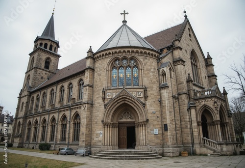 Fototapeta premium Photo of an old church in Europe with a classic style, an old European building, a religious center and a historical tourist destination attraction in Europe.