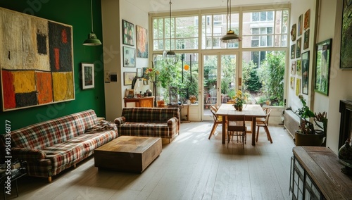 © Sameul, Fototapeta premium Photo of an open-plan living room in Amsterdam, with large windows and a wooden floor. A dining table, a sofa covered by a plaid blanket. Created with Ai