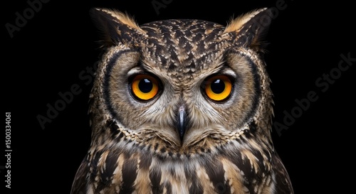 Fototapeta premium Photo Of An Owl's Intense Gaze With Bright Orange Eyes On Black Backdrop