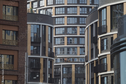 © Всеволод Коркунов, Fototapeta premium Photo of an urban landscape with parts of the facades of buildings under construction. Architecture of the 21st century. Dark facades made of glass and plastic. Rounded buildings.