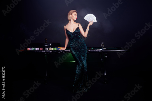 © Beauty Hero, Fototapeta premium Photo of attractive chic girl hold money dollars fan showing winning combination for slot jackpot