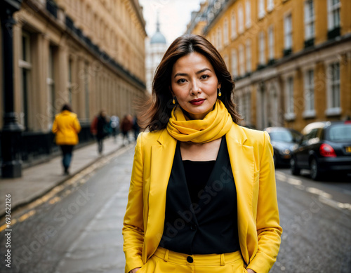 Fototapeta premium photo of beautiful asian woman with yellow suit and scarf standing at street...