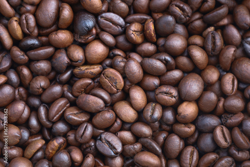 © LiamProject, Naklejka premium Photo of Big pile of fresh roasted coffee beans close up. Food photo for backdrops or recipes