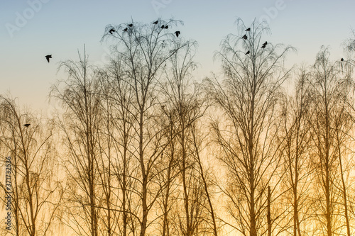 Obraz premium Photo of birches at sunrise with sitting crows
