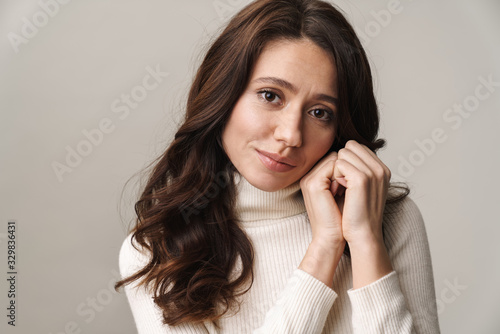 © Drobot Dean, Fototapeta premium Photo of caucasian happy woman with long brown hair smiling at camera