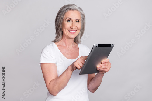 © deagreez, Fototapeta premium Photo of cheerful confident senior lady tape tablet wear white t-shirt isolated on grey color background