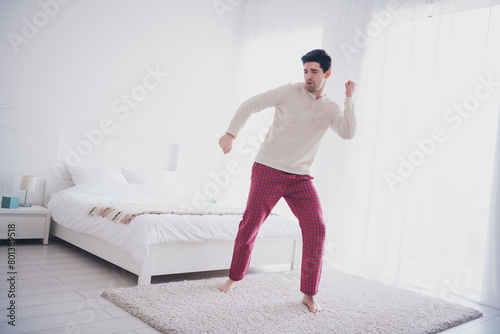 Fototapeta premium Photo of cheerful positive carefree man wearing trendy pajama dancing alone in bedroom indoors