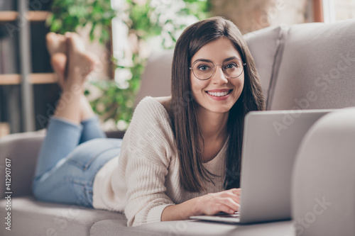 © deagreez, Naklejka premium Photo of cheerful positive girl use laptop lie sofa in living room stay home good mood inside house indoors home