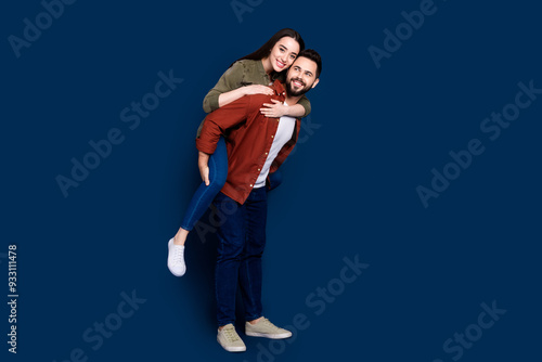 © deagreez, Fototapeta premium Photo of cheerful positive married couple wife husband wear stylish clothes mall store isolated on dark blue color background