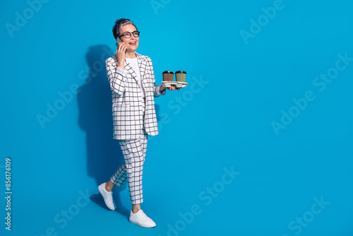 © deagreez, Fototapeta premium Photo of cheerful successful woman wear white stylish clothes walk carry coffee empty space isolated on blue color background
