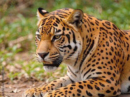 © Palash, Obraz premium Photo of closeup portrait of a majestic jaguar with striking spotted fur, intense gaze, and whiskers, showcasing its powerful and wild nature in its natural habitat