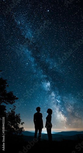 © Da, Fototapeta premium Photo of Couple Silhouettes Watching the Stunning Milky Way in the Night Sky