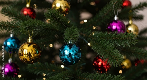 Fototapeta premium Photo of Decorated Christmas Tree with Colorful Ornaments and Lights