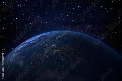 © Kamran, Obraz premium Photo of Earth in Space at Night with Stars Blue Glow and Dark Atmosphere