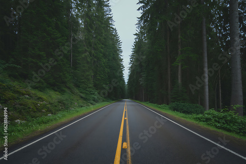 Naklejka premium Photo of empty asphalt road through a green forest with tall trees on a cloudy day
