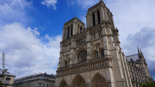 Fototapeta premium Photo of famous Notre Dame cathedral on a cloudy spring morning, Paris, France