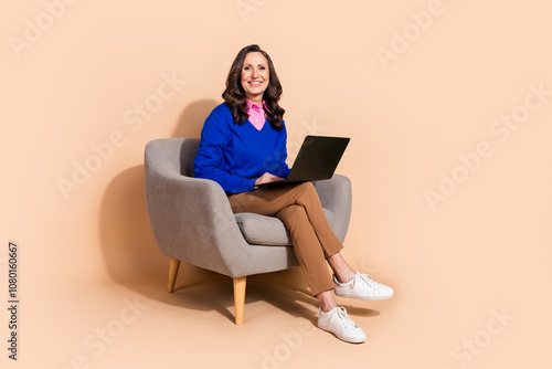 Naklejka premium Photo of gorgeous positive successful woman wear blue trendy clothes sit office armchair isolated on beige color background