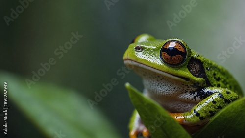 © M.Taufiq, Naklejka premium photo of green frog with brown eyes on a leaf made by AI generative