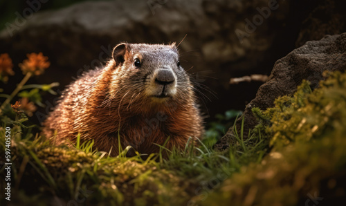 Fototapeta premium Photo of groundhog, captured as it emerges from its burrow in early morning light. composition highlights animal's natural habitat, with lush greenery and a soft, diffused background. Generative AI