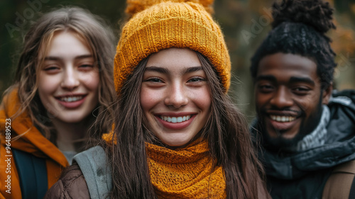 © Julia Zarubina, Obraz premium photo of group of cheerful young people of different nationalities in park, friends, students, diversity, smiling girl, boy, man, woman, friendship, teenagers, youth, hiking, walk, portrait, community