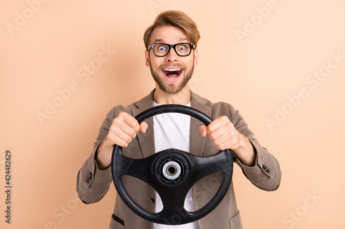 © deagreez, Fototapeta premium Photo of happy excited good mood crazy businessman riding car hold steering wheel isolated on beige color background