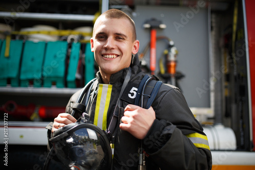 © Sergey Mironov, Obraz premium Photo of happy firefighter standing near fire truck with fire hose