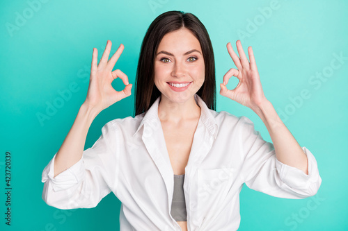 © deagreez, Fototapeta premium Photo of happy nice cheerful young woman make okay signs approve advert isolated on teal color background
