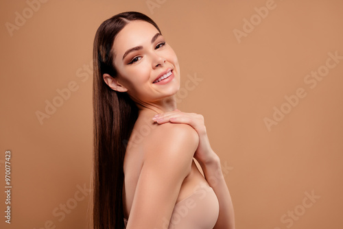 © Beauty Hero, Obraz premium Photo of happy positive girl touch hand feel gentle isolated pastel color background