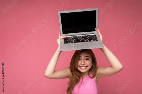 © Ivan Traimak, Naklejka premium Photo of happy satisfied Beautiful young blond woman holding computer laptop with empty monitor display wearing pink crop top looking at camera isolated on pink background
