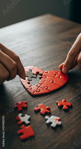 © StephenW, Obraz premium Photo of Heart Puzzle with Missing Piece Hands on Wooden Table