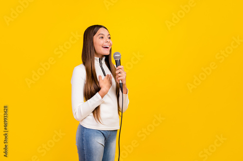 © deagreez, Obraz premium Photo of impressed sweet student girl wear white zip shirt smiling singing song looking empty space isolated yellow color background
