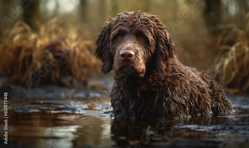 Fototapeta premium photo of Irish water spaniel standing in water with forest background. Generative AI