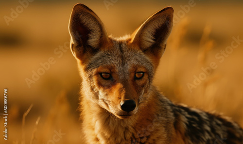 © Bartek, Obraz premium Photo of jackal in the scorching heat of the African savannah, lighting highlights the jackal's wild and cunning nature with slender frame, sharp features, and piercing gaze. Generative AI