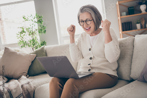 © deagreez, Naklejka premium Photo of lucky impressed elderly lady wear white cardigan winning egame modern gadget indoors apartment room