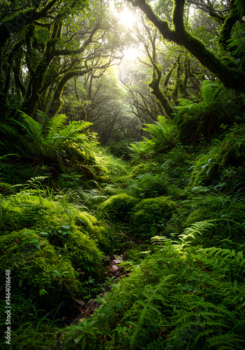 Obraz premium Photo of Lush Green Forest with Sunlight Streaming Through Trees