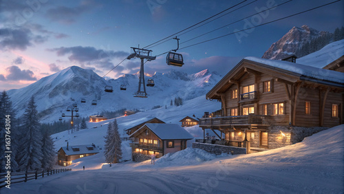 Obraz premium Photo of luxury Alpine ski resort at twilight with cozy wooden chalet at...