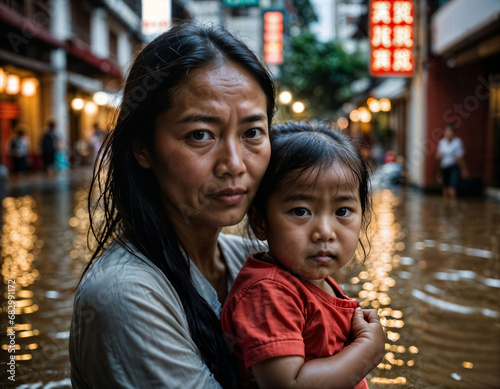 © Flash, Fototapeta premium photo of middle aged asian woman with daughter during heavy rain and flood on road at chinatown street at night, generative AI