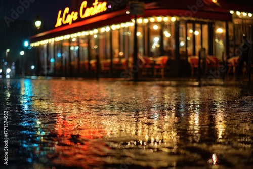 Fototapeta premium photo of modern café glowing warmly during rain at night, reflections on wet...