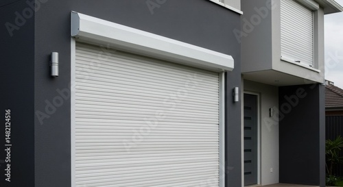 © Siasart Studio, Fototapeta premium Photo of Modern House Exterior with White Roller Shutter Garage Door