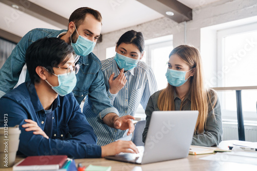 Fototapeta premium Photo of multinational students in medical masks studying with laptop